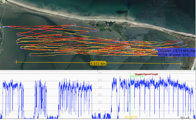 Well, not so fast, cowboy! We don't usually sail around for 2 minutes at our top speed. So let's look at more realistic data. I started by downloading a few GPS tracks from ka72.com. Here is what the fastest 10 second run from the Aussie speedsurfer "Cookie" on November 11, 2016 looked like: