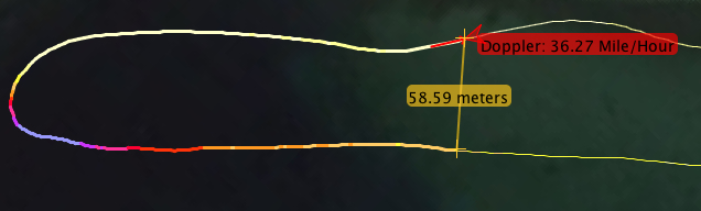Well, not so fast, cowboy! We don't usually sail around for 2 minutes at our top speed. So let's look at more realistic data. I started by downloading a few GPS tracks from ka72.com. Here is what the fastest 10 second run from the Aussie speedsurfer "Cookie" on November 11, 2016 looked like: