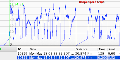 Boz had his GPS set to a minimum speed of 5 knots, so a lot of points where the speed was lower are missing from the track. The reported 1-hour speed is 8.372 knots, corresponding to a travel distance of 15.5 km. But GPS Speedreader gave a higher speed: