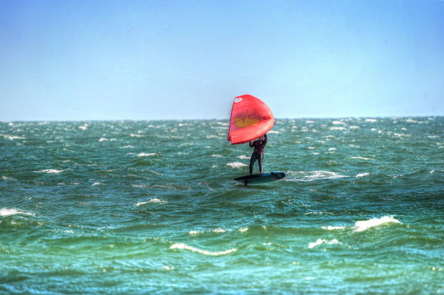 Instead, I headed into the flat water behind the Hyannis Port pier, and pushed the foil a bit faster than I had ever foiled before. By then, the wind had picked up into the mid-20s, and it was time to head back in. The strong wind made for a very interesting ride in steep chop. And then, it got even stronger, hitting 29 mph averages and gusts in the low 30s. Waterstarts, which were difficult, one-footed, and only in gusts at the beginning had long changed to the two-footed, "keep the thing controlled at all cost!" variety, were not placing enough weight on the front foot meant I was foiling before I was even over the board. But now, I was either getting catapulted right away, or the wind just grabbed under the board and flipped it over, completely ignoring the heavy aluminum foil. Not even body-dragging with one foot on the board, my usual fail-safe when things get crazy, worked - board and foil were blown out of the water and flipped over within a couple of seconds. Eventually, I discovered that body-dragging clew first from the leeward side worked, with the added benefit of being an excellent workout. After dragging a quarter mile downwind, the wind finally let up enough so that I could waterstart again, and foil in the last bit, with a fully flagged out sail. Meanwhile, Nina, who had been wing foiling on her 4.2 the entire time, stuck around and enjoyed that the strong wind let her foil through her jibes with ease. Maybe I need to get one of these things ... but I have the suspicion it just would not work quite as well for me.